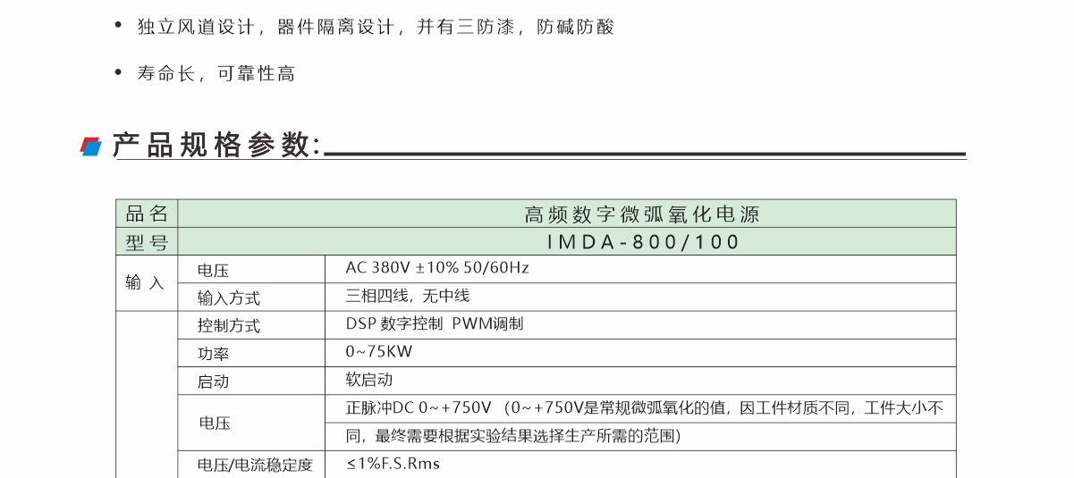 該電源為脈沖電源,為微弧氧化等需要脈沖的電壓和電流的情況而設(shè)計(jì)。電源采用高頻隔離設(shè)計(jì),采用先進(jìn)的DSP控制,輸出電壓穩(wěn)定,不因輸入電壓波動(dòng)而變化。
