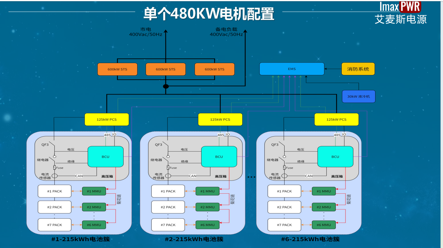 采用6套215kWh儲能系統(tǒng),采用一簇一管理的方式進行控制,避免簇間環(huán)流; 3臺600KW STS匯流,方便接線與維護; 液冷系統(tǒng)采用30kW液冷機進行集中式管理