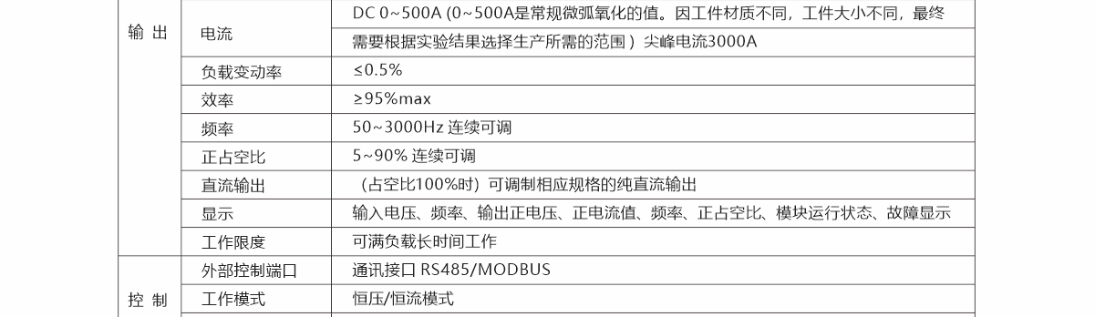 該電源為脈沖電源,為微弧氧化等需要脈沖的電壓和電流的情況而設(shè)計(jì)。電源采用高頻隔離設(shè)計(jì),采用先進(jìn)的DSP控制,輸出電壓穩(wěn)定,不因輸入電壓波動而變化。輸出頻率和占空比可調(diào)。