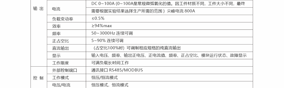 該電源為脈沖電源,為微弧氧化等需要脈沖的電壓和電流的情況而設(shè)計(jì)。電源采用高頻隔離設(shè)計(jì),采用先進(jìn)的DSP控制,輸出電壓穩(wěn)定,不因輸入電壓波動(dòng)而變化。