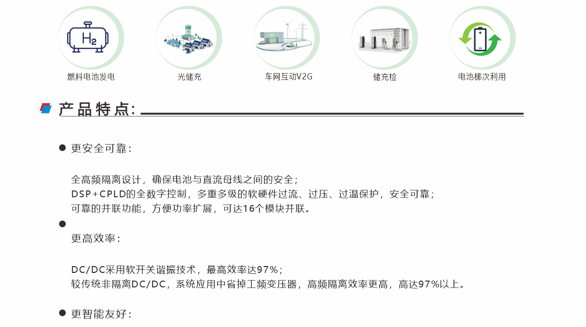 廣泛應(yīng)用于以下應(yīng)用場(chǎng)景:如燃料電池發(fā)電、儲(chǔ)能、儲(chǔ)充、光儲(chǔ)充、儲(chǔ)充檢、電池梯次利用儲(chǔ)能、車(chē)網(wǎng)互動(dòng)V2G等多能互補(bǔ)的場(chǎng)景,輸入輸出高頻隔離,是能量雙向流動(dòng)應(yīng)用行業(yè)的首選產(chǎn)品