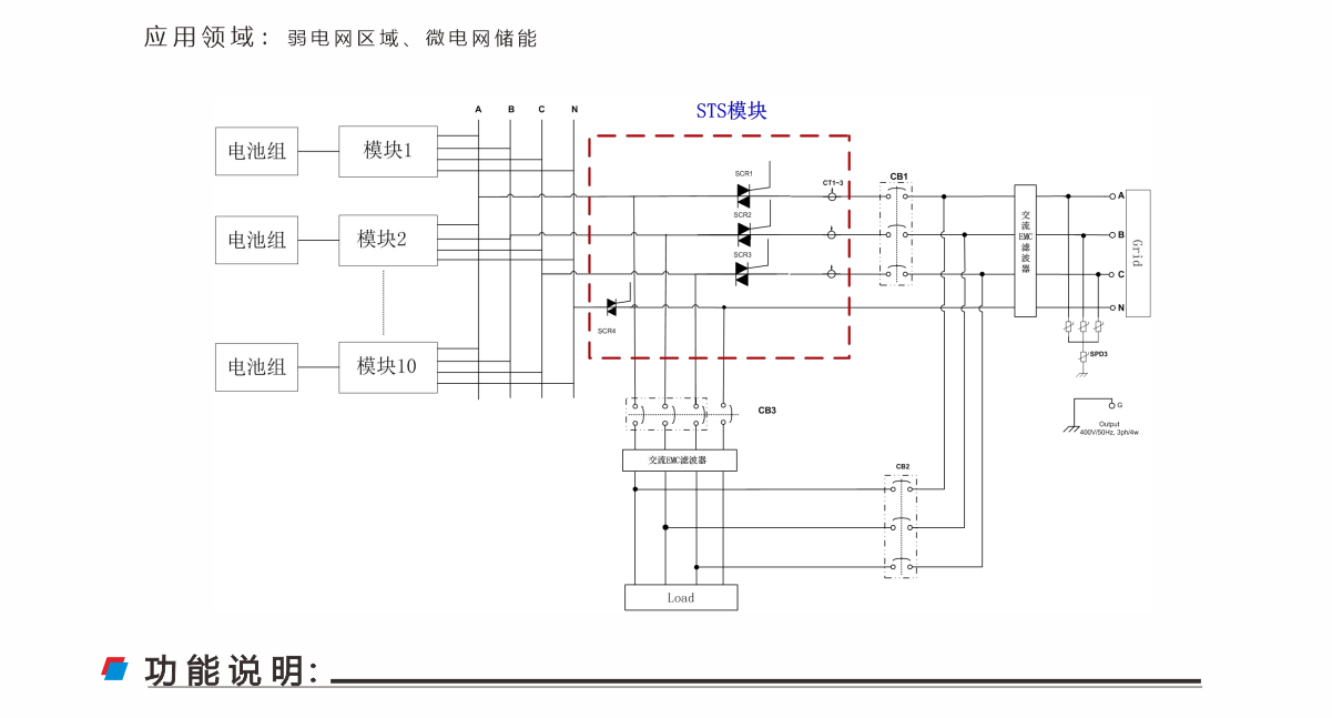 該并離網(wǎng)切換 STS 模塊采用靜態(tài)開(kāi)關(guān)無(wú)縫切換技術(shù),支持并離網(wǎng)無(wú)縫切換;采用 DSP 設(shè)計(jì),支持 CAN RS485 通信。該模塊廣泛應(yīng)用于并離網(wǎng)切換的應(yīng)用場(chǎng)景,如弱電網(wǎng)區(qū)域、微 電網(wǎng)儲(chǔ)能等