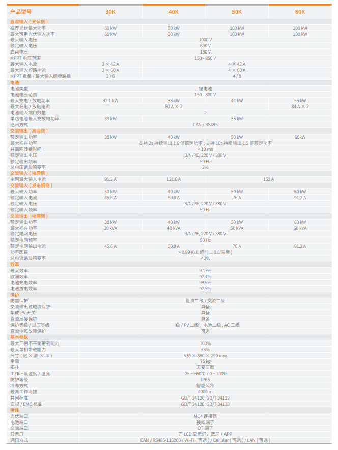 該系列逆變器配備2路電池接口,充放電電流高達84A + 84A(60K),能夠快速、高效地為電池進行充放電操作,滿足工商業(yè)場景下頻繁的充放電需求,減少充電等待時間,提高能源利用效率。