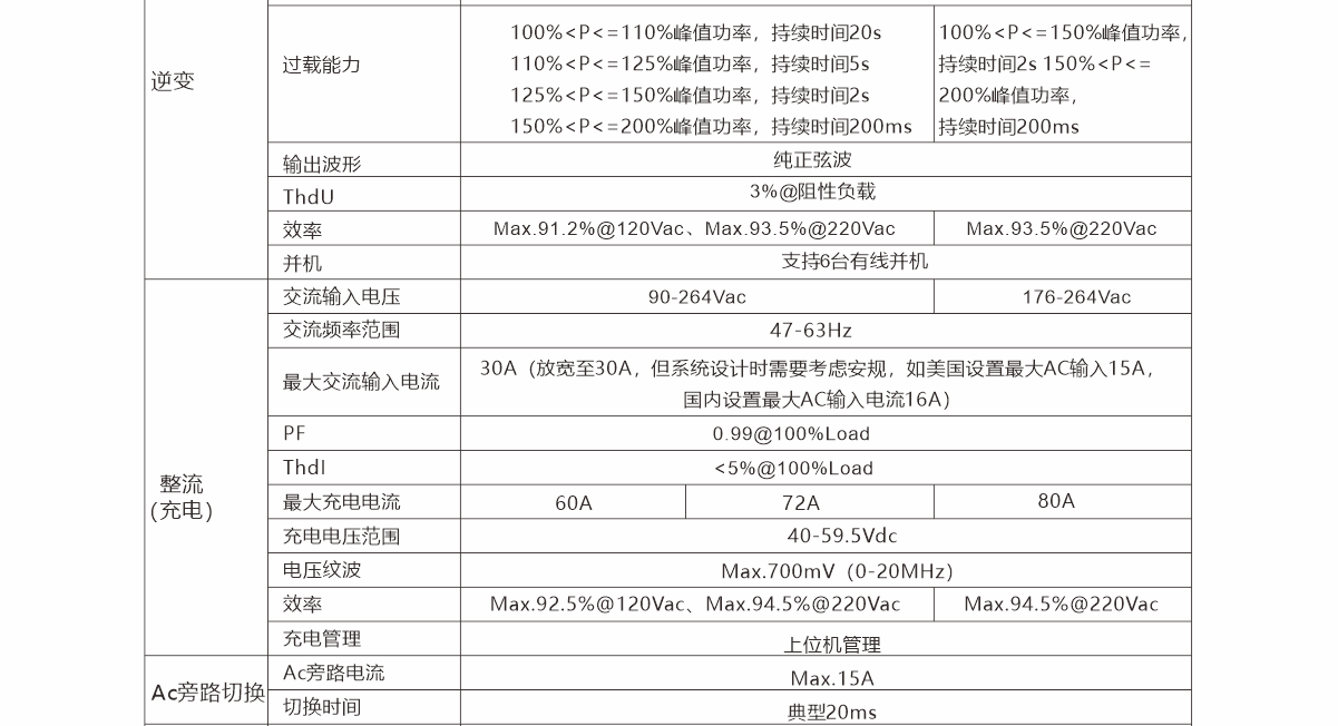 BIM系列3000-3600-4200W為多功能雙向PCS模塊,采用高效軟開(kāi)關(guān)專利拓?fù)浜蛿?shù)字控制技術(shù),集成純正弦波逆變器、大功率充電器、UPS旁路、RS485和CAN通訊端口、并機(jī)等功能。